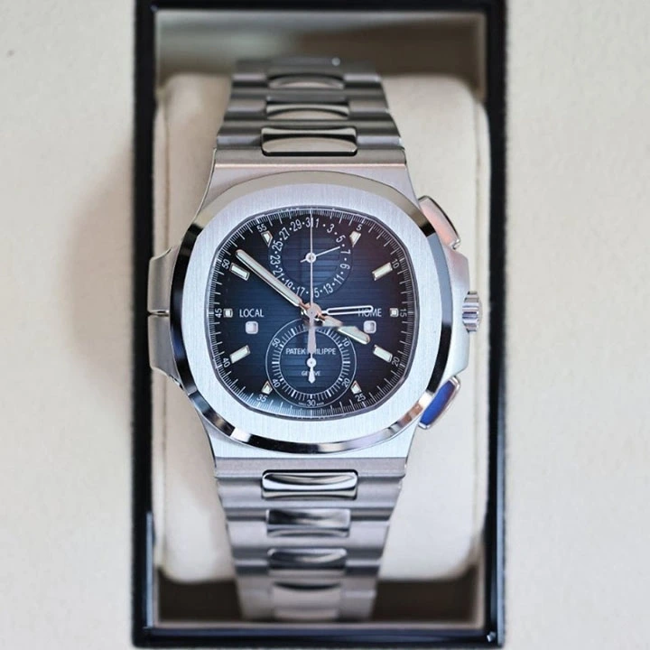 The Ref. 5990/1A-011 Nautilus Travel Time chronograph is one of Patek Philippe??s rare steel watches. It features a new blue dial with a ray sunburst dial and a delicate black gradation to the periphery.