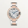 Roman numerals are guided on their path by a deep blue winding mechanism. The convex curves of the case, guilloch?? dial, sword-shaped hands, and polished or satin-finish links of the bracelet ensure that the Ballon Bleu watch by Cartier floats within the world of Cartier watchmaking.