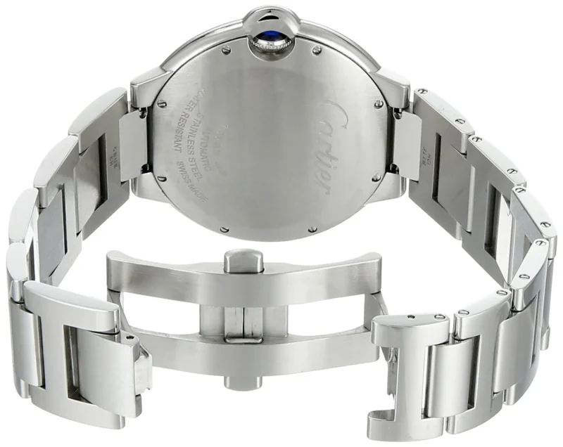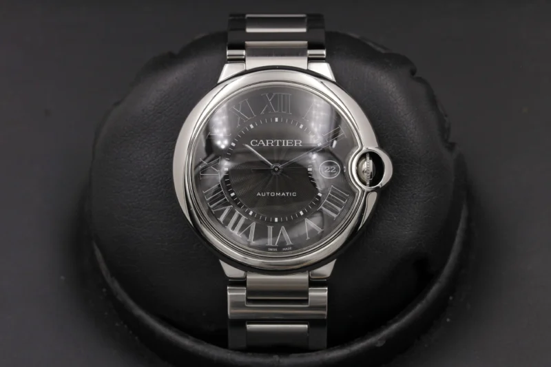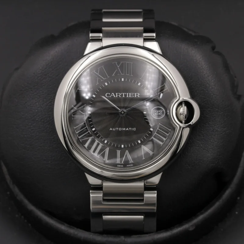 Cartier Ballon Bleu stainless steel case with black guilloch?? dial with Roman numerals and date at 3 o’clock. Automatic movement. Comes with a Cartier stainless steel bracelet with deployant clasp. Fits 6-1/2″ wrists