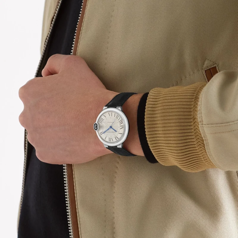 Ballon Bleu de Cartier watch, 40 mm, mechanical manufacture movement with automatic winding, caliber 1847 MC. Steel case, fluted crown set with a synthetic spinel cabochon, silvered guilloch?? dial, blued-steel sword-shaped hands??