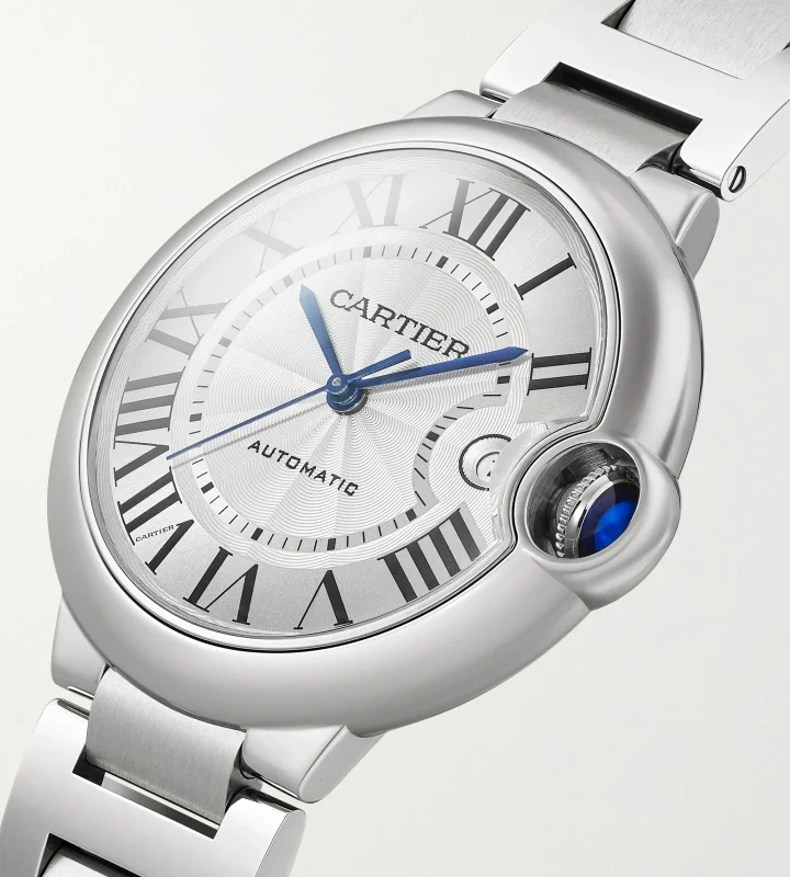 Ballon Bleu de Cartier watch, 40 mm, mechanical manufacture movement with automatic winding, caliber 1847 MC. Steel case, fluted crown set with a synthetic spinel cabochon, silvered guilloch?? dial, blued-steel sword-shaped hands, sapphire crystal, stainless steel interchangeable bracelet, 3 o’clock There is a calendar window at the clock position. Thickness: 12.4mm. Water-resistant to 3 bar (approx. 30 meters/100 feet).