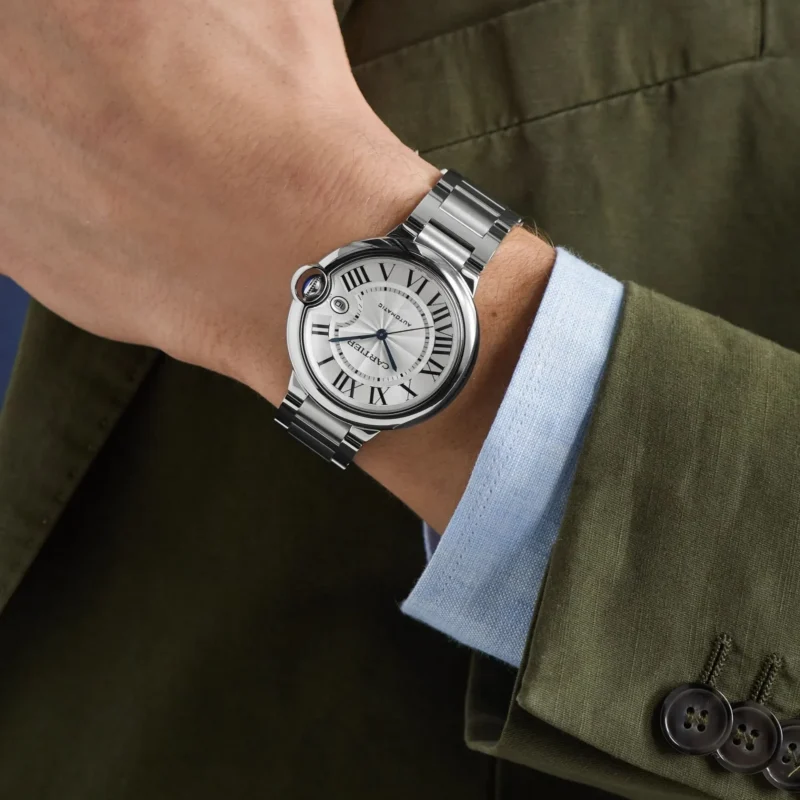Ballon Bleu de Cartier watch, 40 mm, mechanical manufacture movement with automatic winding, caliber 1847 MC. Steel case, fluted crown set with a synthetic spinel cabochon, silvered guilloch?? dial, blued-steel sword-shaped hands, sapphire crystal, stainless steel interchangeable bracelet, 3 o’clock There is a calendar window at the clock position. Thickness: 12.4mm. Water-resistant to 3 bar (approx. 30 meters/100 feet).