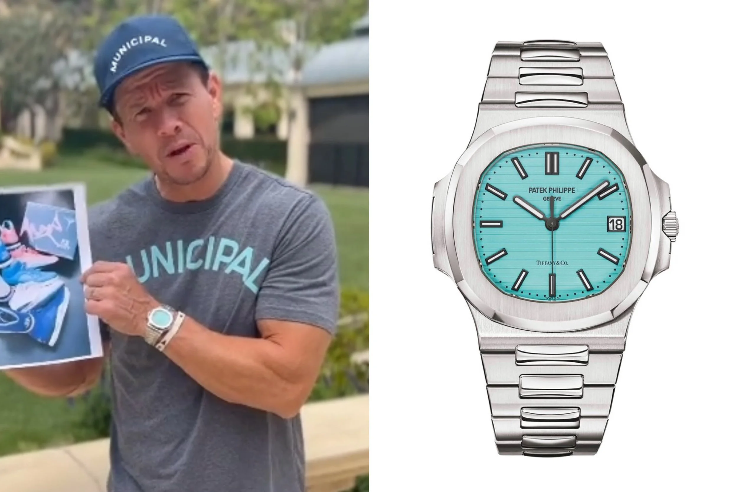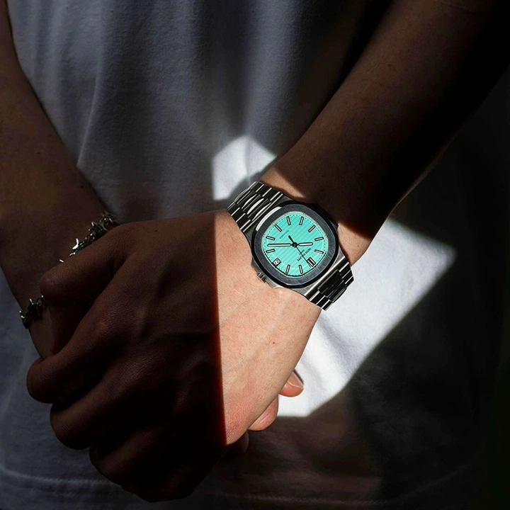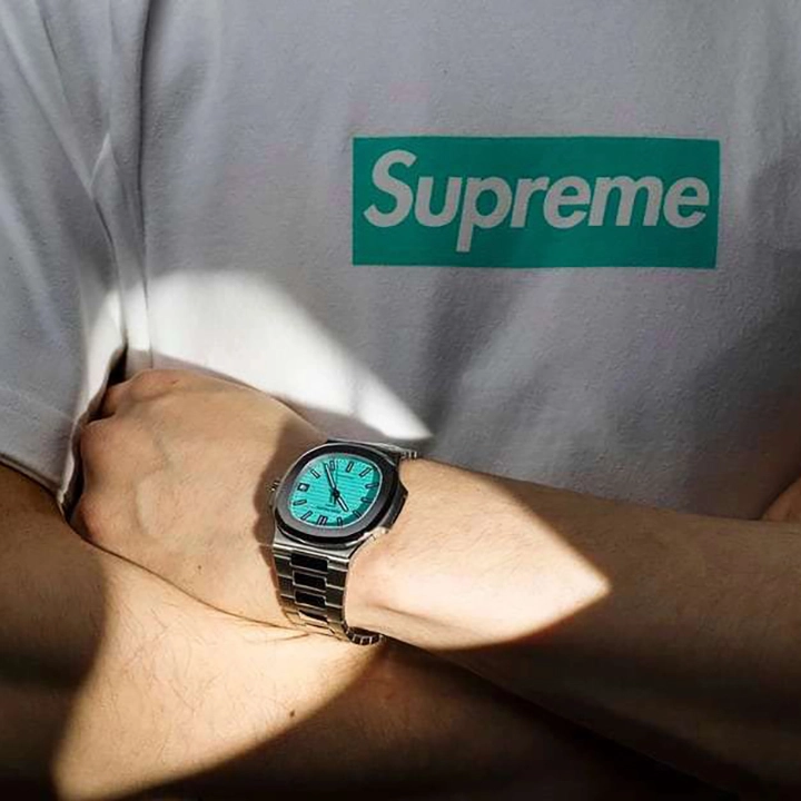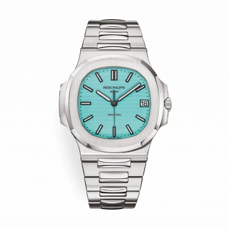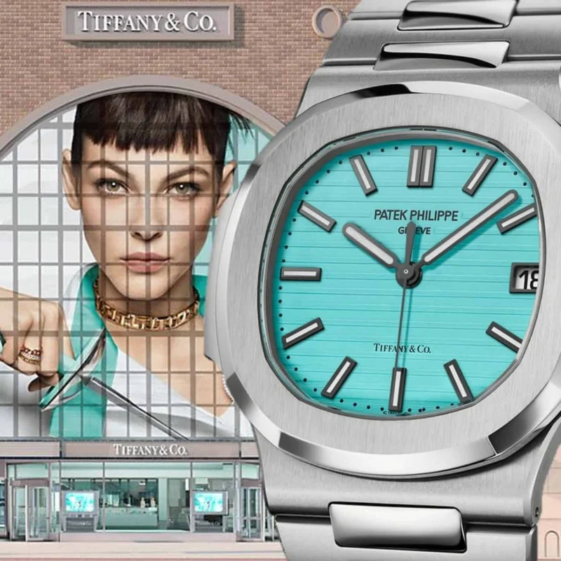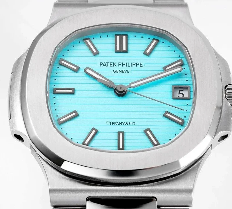 Specifications include a brass dial with Tiffany Blue? lacquer and with horizontal Nautilus embossing, black printed Patek Philippe Gen??ve, and Tiffany & Co. signatures (hence the term double-signed Nautilus), applied hour markers in blackened 18k white gold, a touch of luminous paint and baton-style hands.?