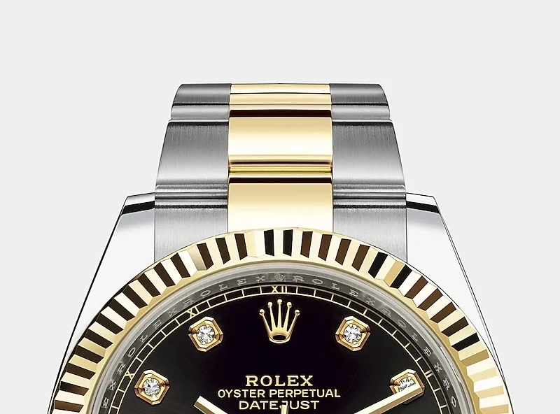 THIS OYSTER PERPETUAL DATEJUST 41 IN OYSTERSTEEL AND YELLOW GOLD FEATURES A BRIGHT BLACK, DIAMOND-SET DIAL AND AN OYSTER BRACELET.