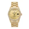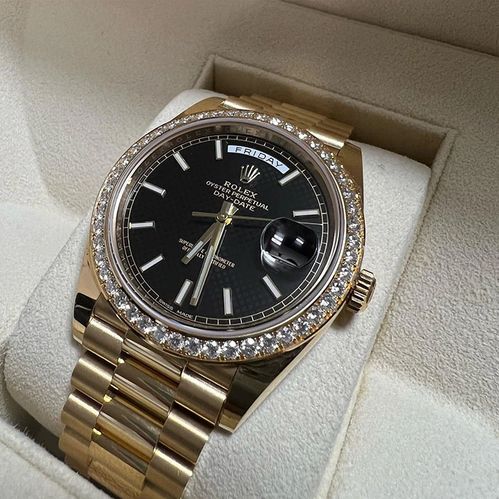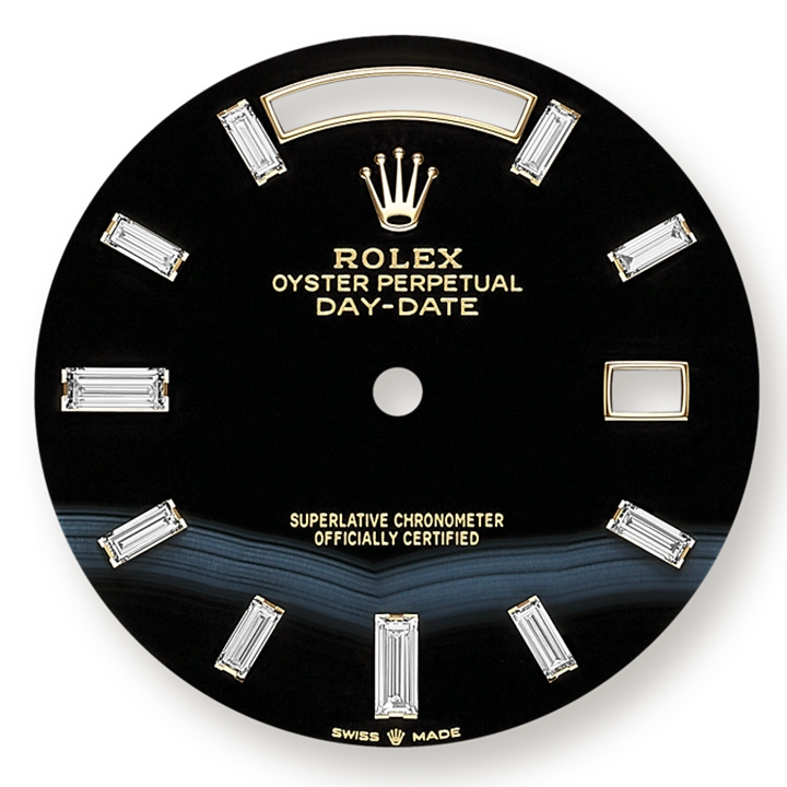 Its dial features 10 baguette-cut diamonds. The Day-Date was the first watch to indicate the day of the week spelt out in full when it was first presented in 1956.
