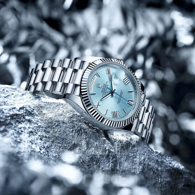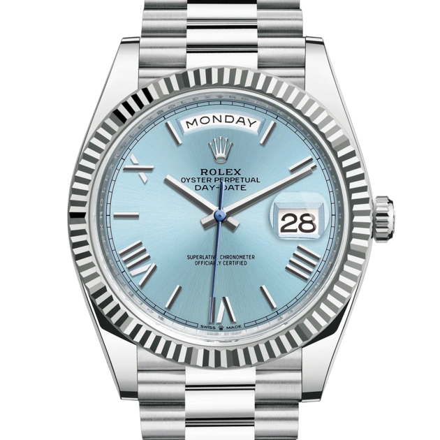 THE OYSTER PERPETUAL DAY-DATE 40 IN PLATINUM WITH AN ICE-BLUE DIAL, FLUTED BEZEL AND A PRESIDENT BRACELET.