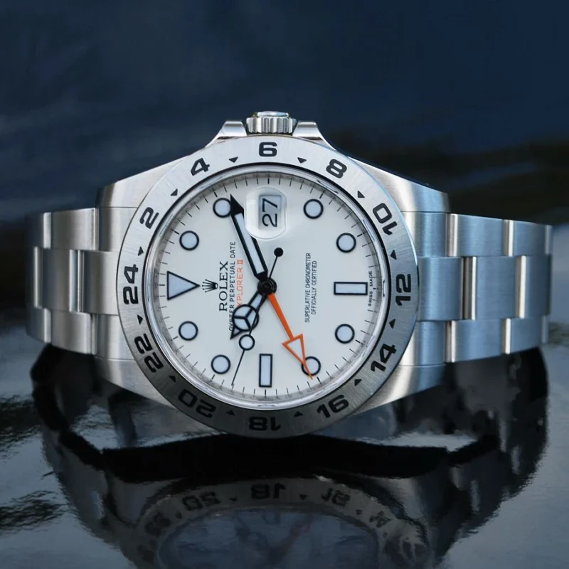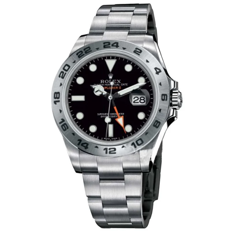 The Explorer II features a date display, an additional orange 24-hour hand and a fixed bezel with 24-hour graduations, enabling day to be distinguished from night. It became the watch of choice for speleologists, volcanologists and polar explorers.