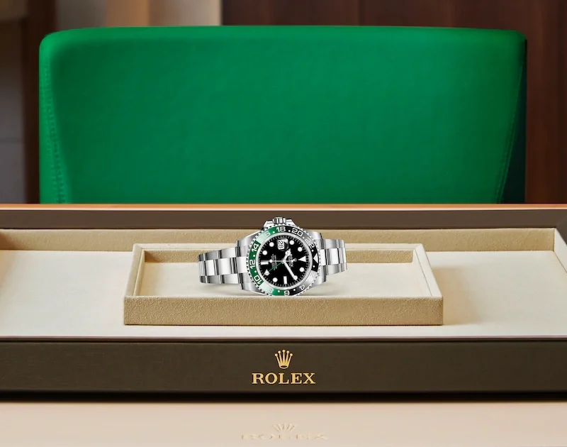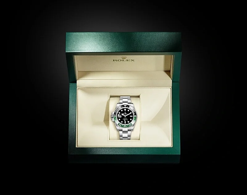 This model features a black dial and a two-colour Cerachrom bezel insert in green and black ceramic. Designed to show the time in two different time zones simultaneously during intercontinental flights, the GMT-Master II has come to be recognized for its robustness and versatile appearance.