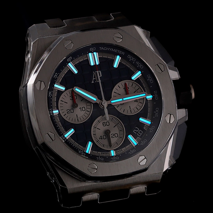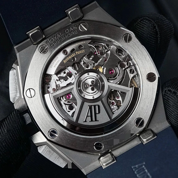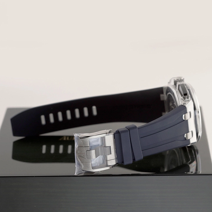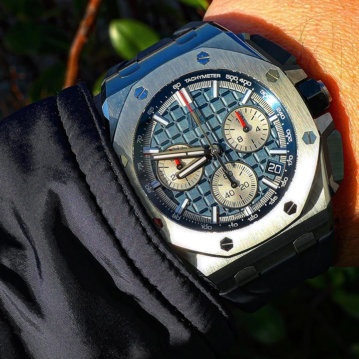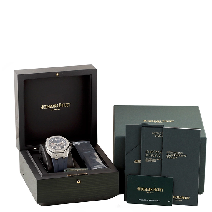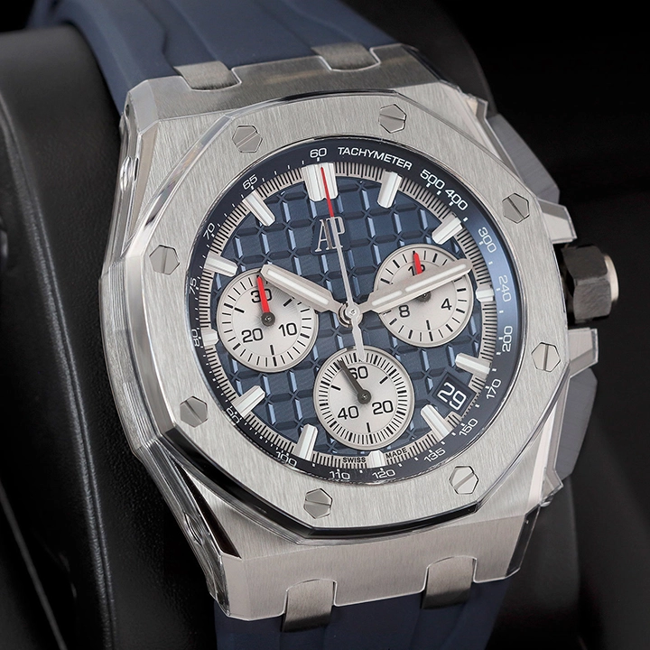 This all-titanium Royal Oak Offshore in 43 mm sports a blue “M??ga Tapisserie” dial with high-end finishing as well as the Manufacture??s interchangeable strap system and latest integrated flyback chronograph.
