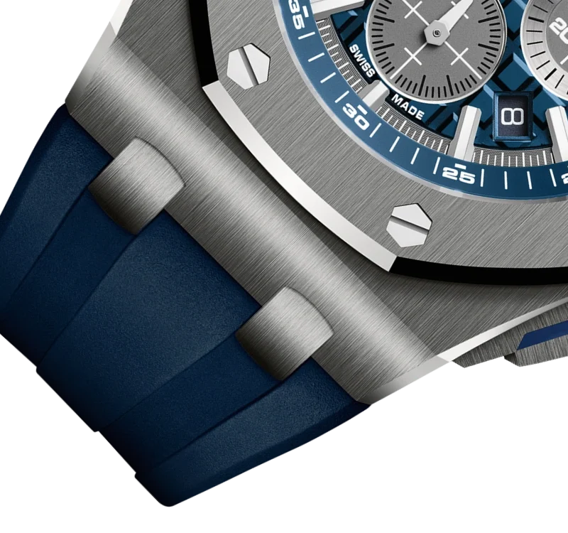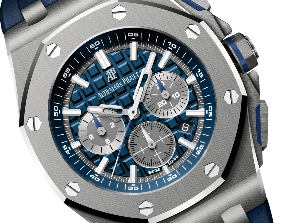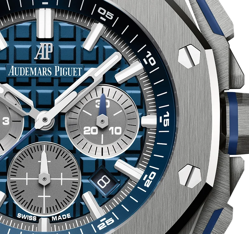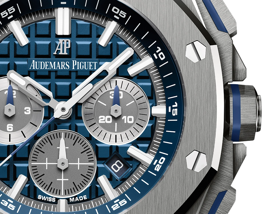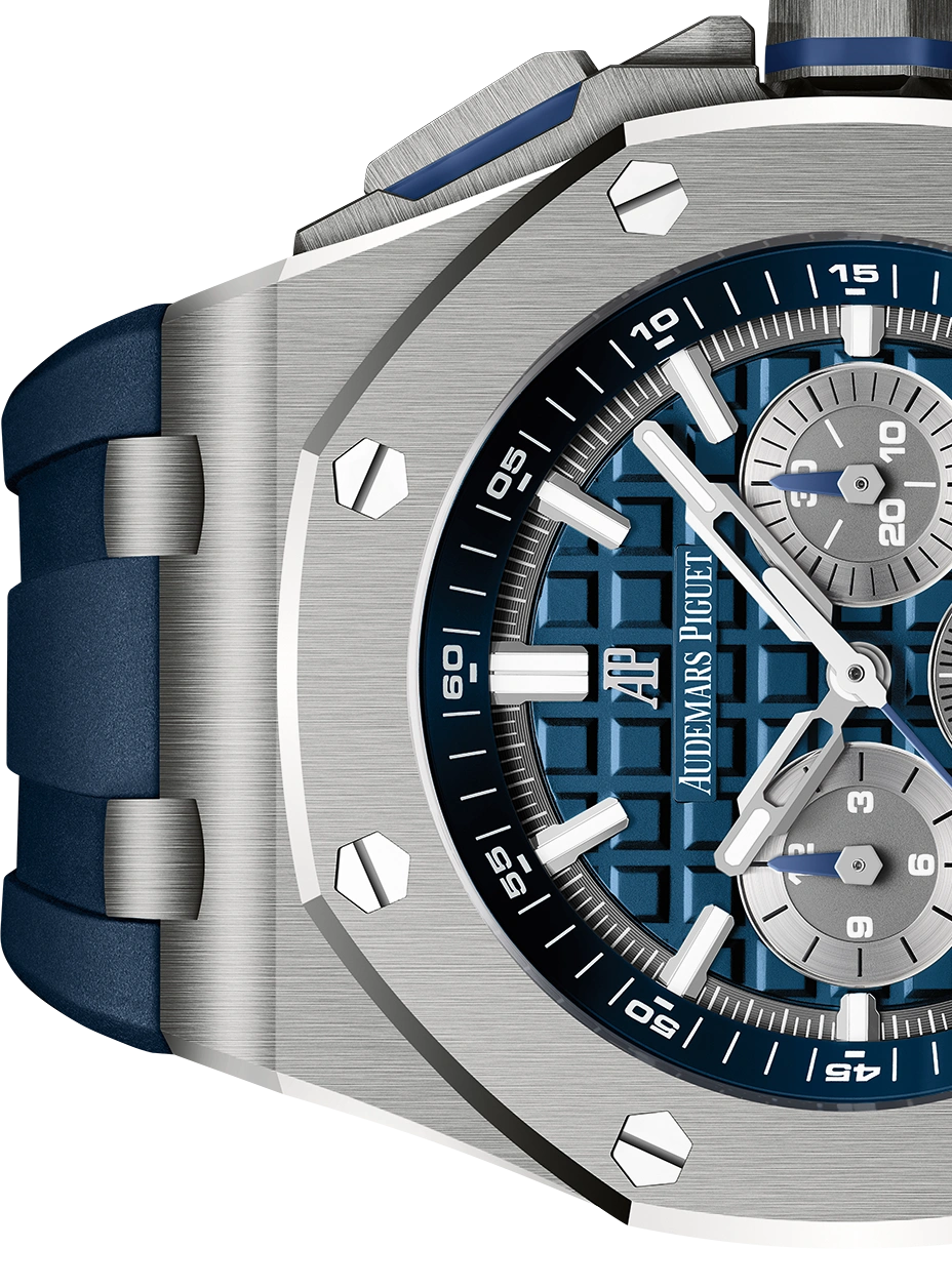 The titanium case of this 42mm Selfwinding Chronograph is enhanced by a blue ??M??ga Tapisserie?? dial and a blue rubber strap.